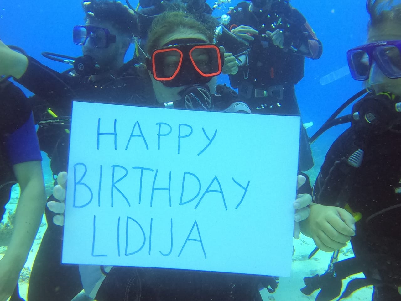 وعبرت ليديا والتي تحمل الجنسية السلوفنية عن سعادتها حيث تفاجأت بأن منظم رحلات بحرية اعد لها تورته وشارك عدد من السائحين الأجانب بالاحتفال بعيد ميلادها بالغطس تحت الماء حملوا لافتة تهنئة وقاموا بالرقص معها تحت الماء بملابس الغطس في اعماق البحر الأحمر.