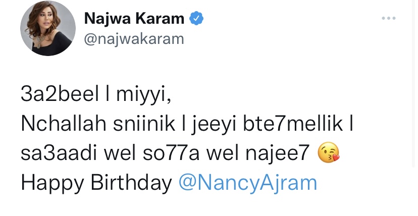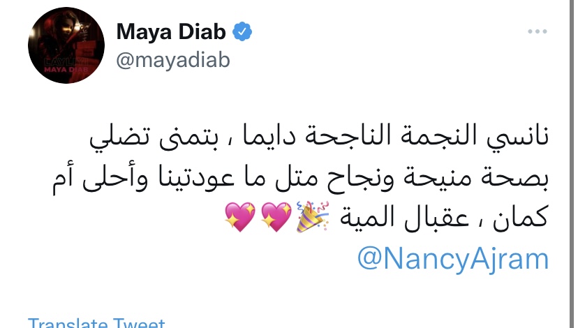 وكتبت مايا دياب في تويتة لها: “نانسي النجمة الناجحة دايما، بتمنى تضلي بصحة منيحة ونجاح متل ما عودتينا وأحلى أم كمان ، عقبال المية”.