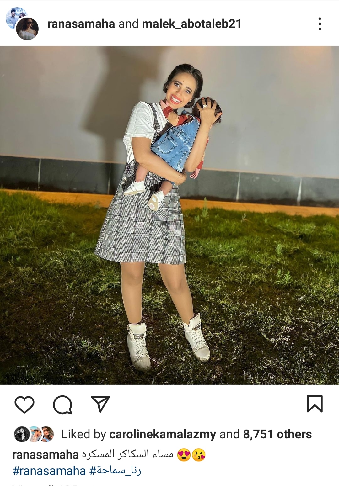 وظهرت رنا سماحة في الصورة بفستان قصير، وظهرت وهي تحمل طفلها، مما نال اعجاب متابعيها.