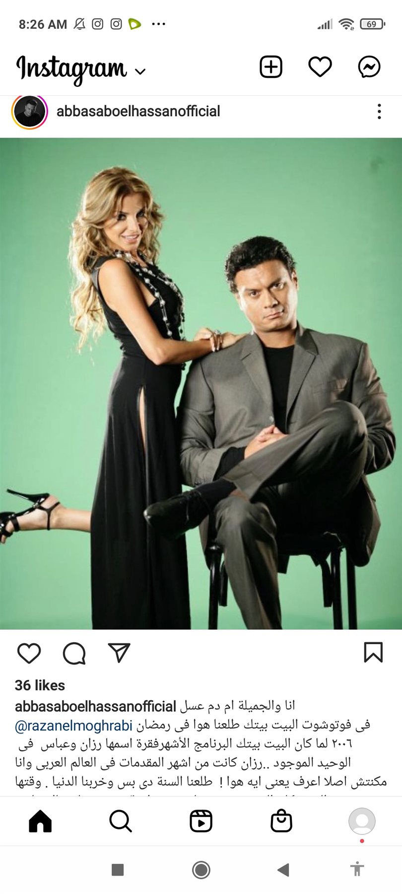 وعلق قائلا :"انا والجميلة ام دم عسل، في فوتوشوت البيت بيتك طلعنا هوا في رمضان ٢٠٠٦ ، لما كان البيت بيتك البرنامج الأشهر، فقرة اسمها رزان وعباس في الوحيد الموجود .. رزان كانت من أشهر المقدمات في العالم العربي وأنا مكنتش أصلا أعرف یعني إیه هوا ! طلعنا السنة دى بس وخربنا الدنيا، وقتها