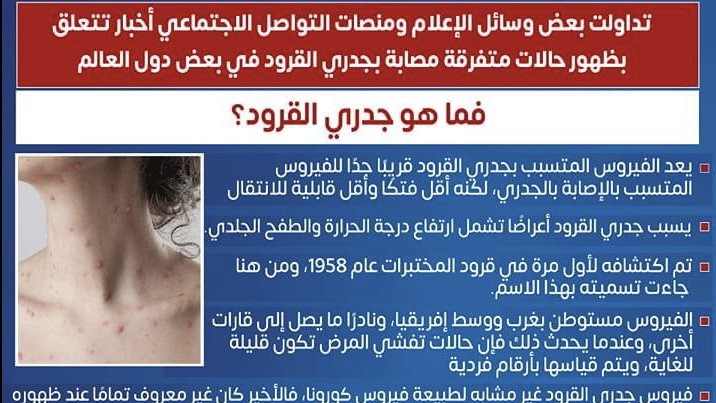 قال الدكتور حسام عبد الغفار، المتحدث الرسمي لوزارة الصحة، إن الفيروس المسبب لجدري القرود قري جدا من الفيروس المسبب الإصابة بالجدري، لكنه أقل فتكا وأقل قابلية للانتقال.
