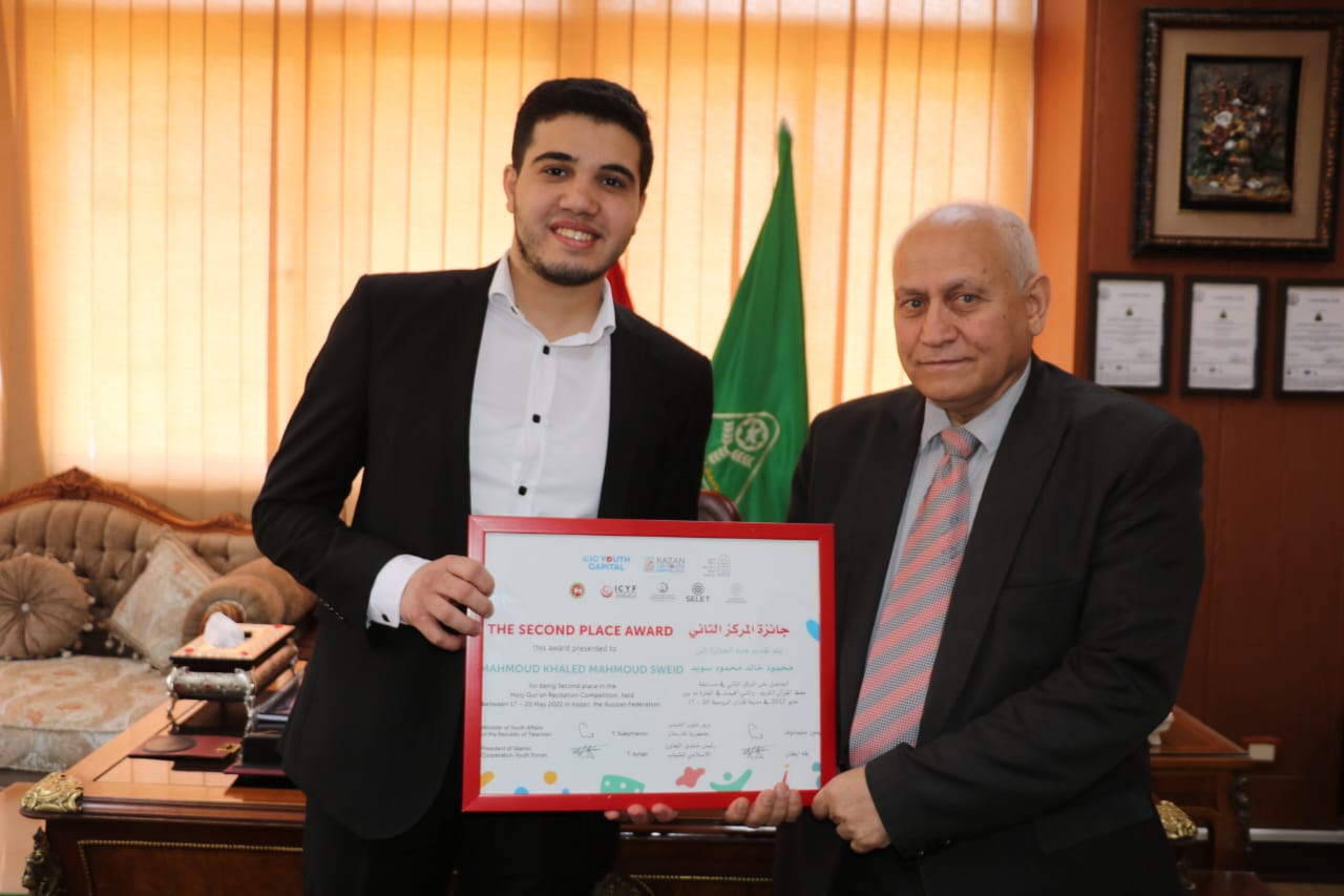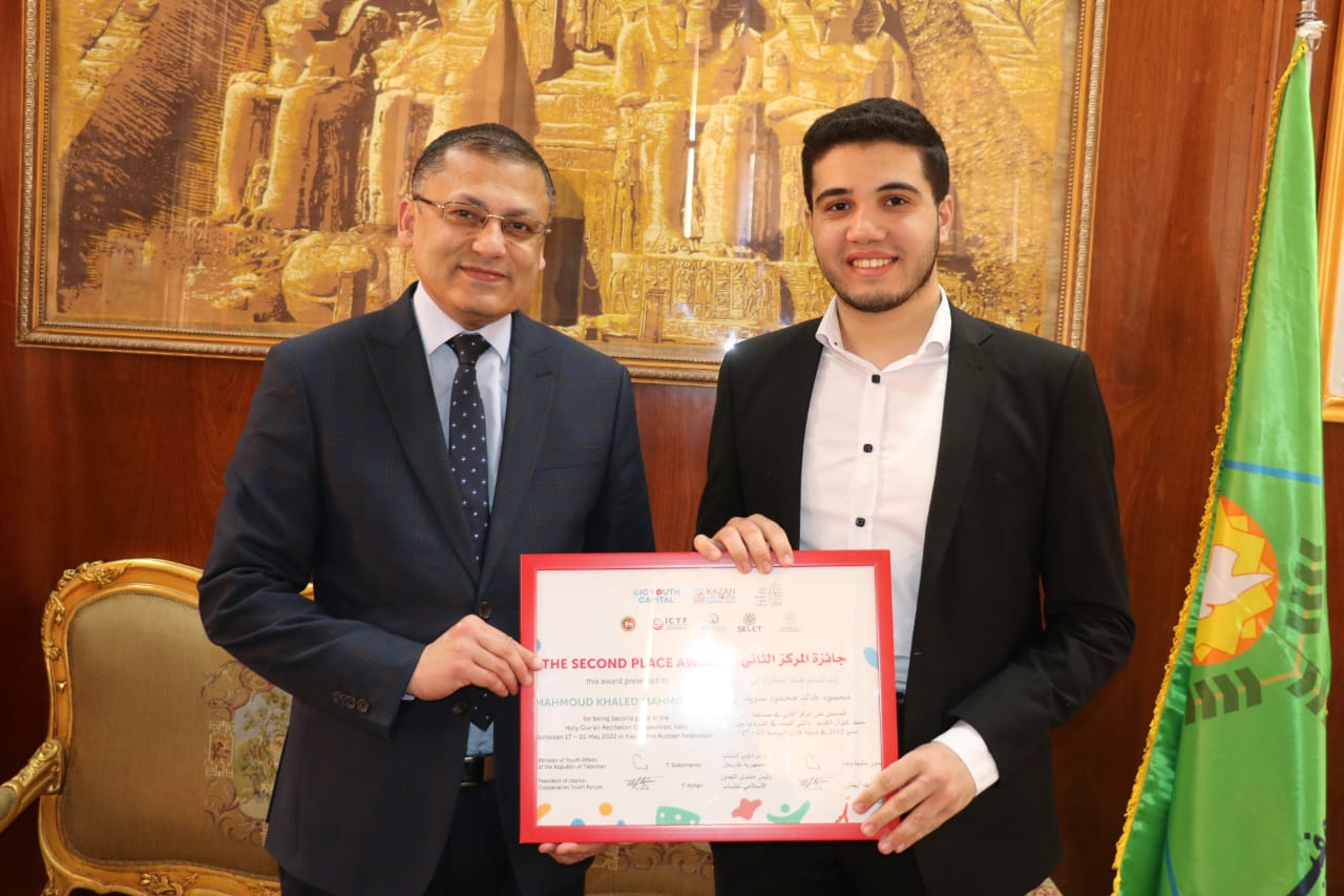 كرم الدكتور عادل مبارك رئيس جامعة المنوفية الطالب محمود خالد سويد طبيب امتياز بمستشفيات جامعة المنوفية والذى فاز بالمركز الثانى على مستوى العالم ممثلا لمصر فى مسابقة حفظ وتجويد القرآن الكريم، التى أقيمت بمدينة قازان العاصمة الإسلامية فى روسيا بمشاركة ٧٠ دولة من الدول العربية والإفريقية والأجنبية.