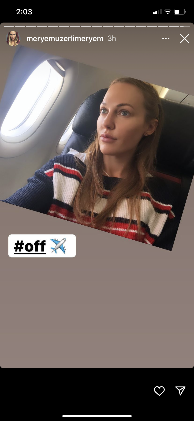 وظهرت مريم أوزرلي في الصورة من الطائرة مما أثار إعجاب متابعيها.