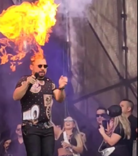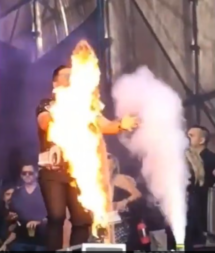 وجاء غناؤه ضمن فعاليات مهرجان “بيسيرو”، ولكن في منتصف العرض، يبدو أن إحدى آلات الدخان في مقدمة المسرح كانت مشتعلة وازداد اشتعال النيران فور اقتراب أفيو منها.
