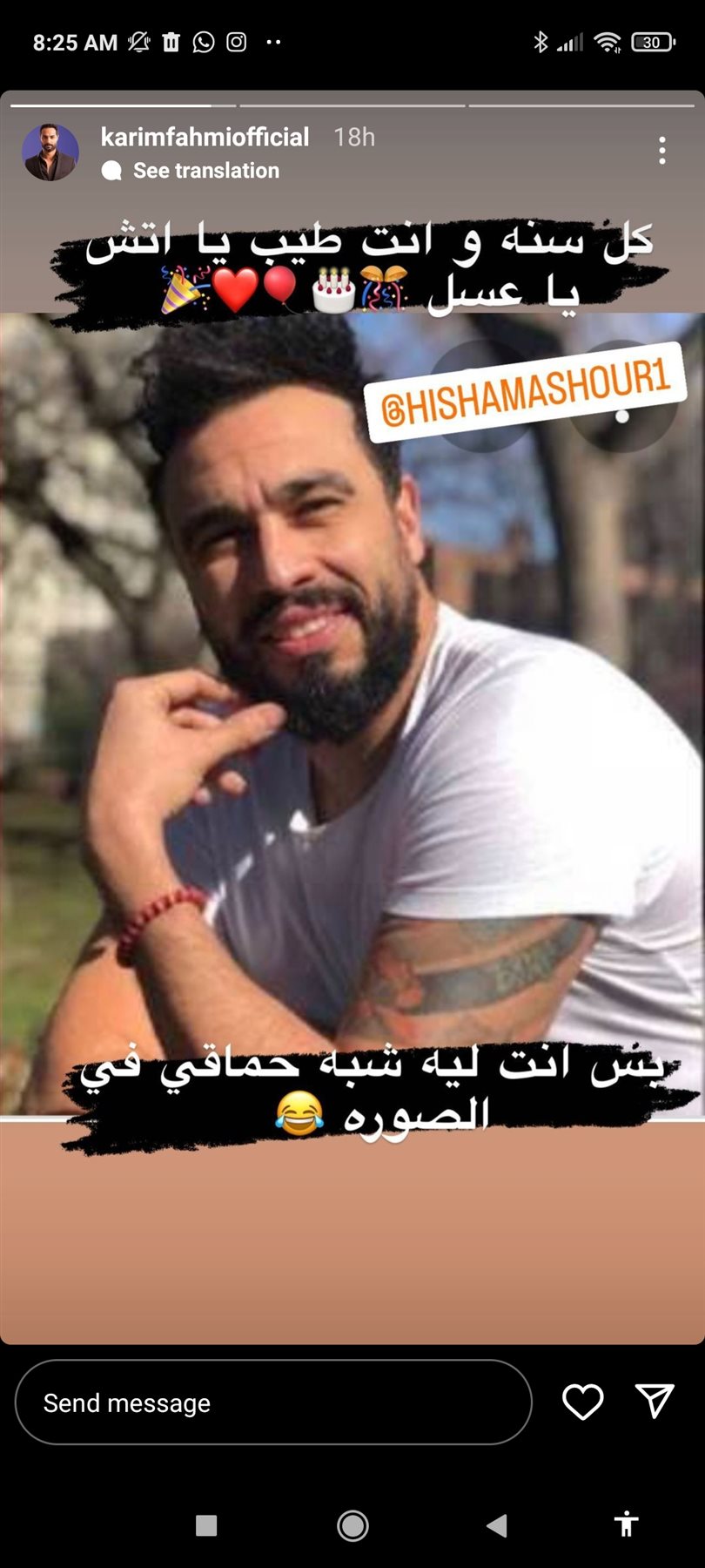 وعلق كريم فهمي “كل سنة وانت طيب يا اتش يا عسل، بس انت ليه شبه حماقى في الصورة”.