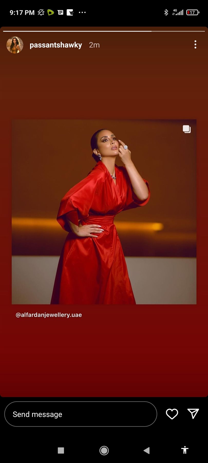 وظهرت بسنت شوقي في الصورة بفستان أحمر انيق، مما نال اعجاب متابعيها.