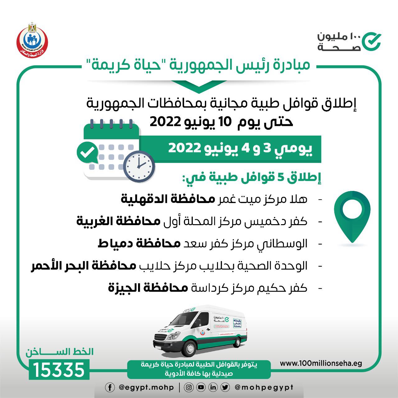 أعلنت وزارة الصحة والسكان، إطلاق 5 قوافل طبية ضمن مبادرة الرئيس عبد الفتاح السيسي “حياة كريمة”، يومي 3 و 4 مايو 2022 للكشف والعلاج مجانًا.
