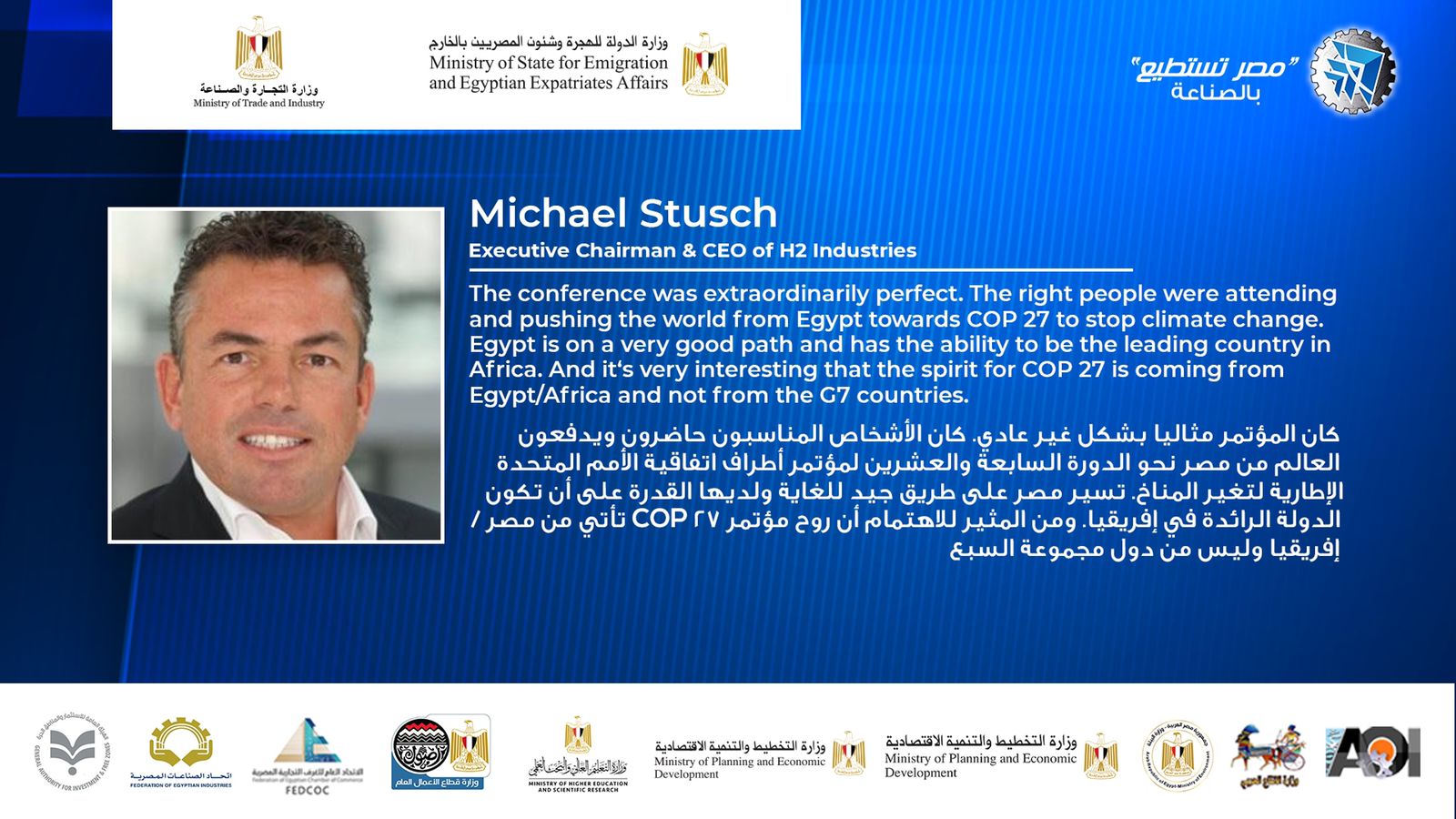 كما وصف مايكل ستوش، الرئيس التنفيذي لشركة H2 Industries بأن المؤتمر كان نموذجيًا إلى حد كبير وقال: "المؤتمر كان مثاليا واختيار المشاركين من الخبراء كان موفقا للغاية"، مضيفا أن مصر تسير على الطريق الصحيح ولديها القدرة أن تكون الدولة الرائدة في أفريقيا.