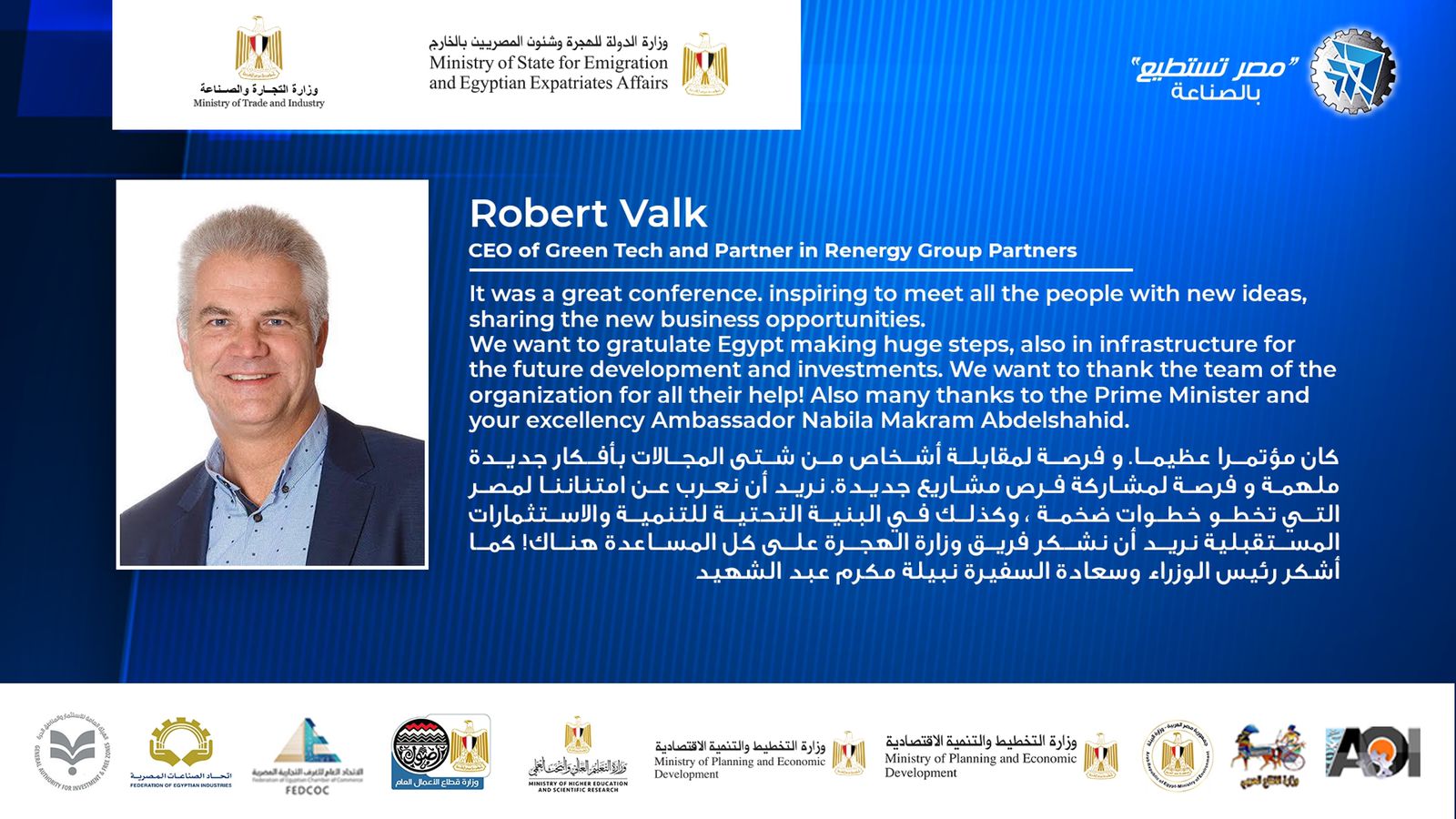 فيما ثمن روبرت فالك، الرئيس التنفيذي لشركة "جرين تك إيجيبت" الهولندية والخبير المشارك في جلسة "شركاء النجاح: آفاق الاستثمار الصناعي في مصر"، الجهود المبذولة لتنظيم المؤتمر والتنوع في موضوعات الجلسات والأفأكر التي تم طرحها، وقال: "لقد كان مؤتمرا عظيما وأتاح لنا الفرصة لمقابلة أشخاص متخصصون في شتى المجالات بأفكار جديدة ملهمة والاطلاع على فرص لإقامة مشاريع جديدة".