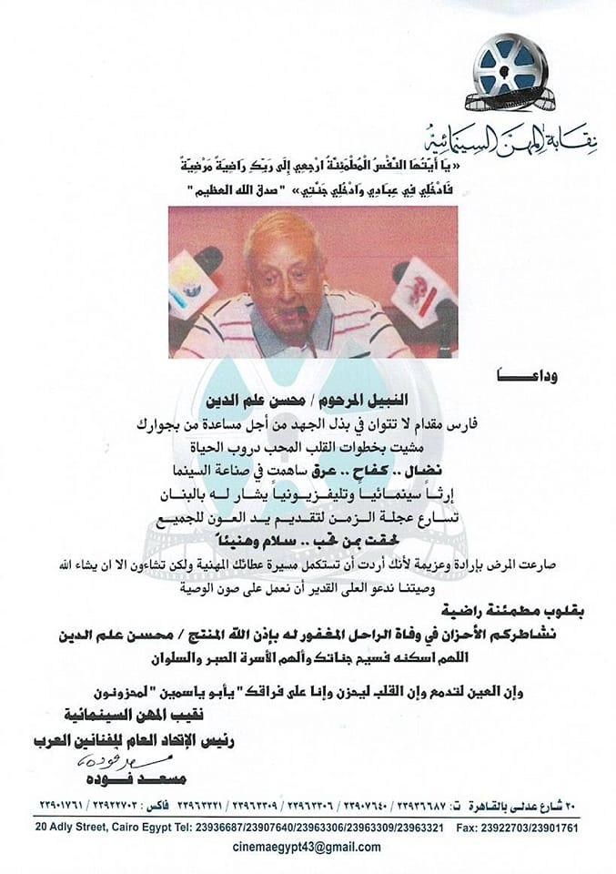 ونشرت نقابة المهن السينمنائية، عبر صفحتها على موقع التواصل الاجتماعي فيسبوك، نعيًا للمنتج الراحل، كتبت فيه: «نعي المنتج الكبير/ محسن علم الدين .. تغمد الله الفقيد بواسع رحمته».