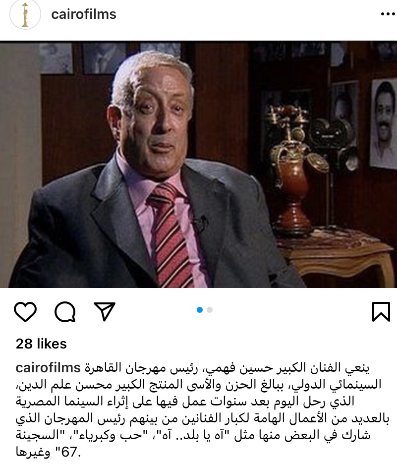 نعت الصفحة الرسمية لمهرجان القاهرة السينمائى الدولى عبر تطبيق انستجرام المنتج الكبير محسن علم الدين الذى رحل عن عالمنا صباح اليوم.