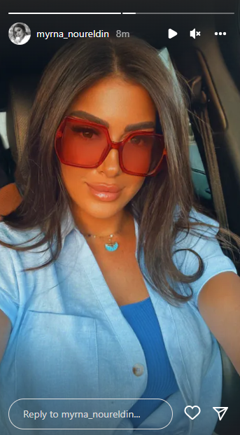 وظهرت ميرنا نور الدين في صورة سيلفي من داخل السيارة، مرتدية قميص باللون اللبني، مع نظارة شمس كبيرة، تاركة خصلات شعرها منسدلة علي أكتافها.