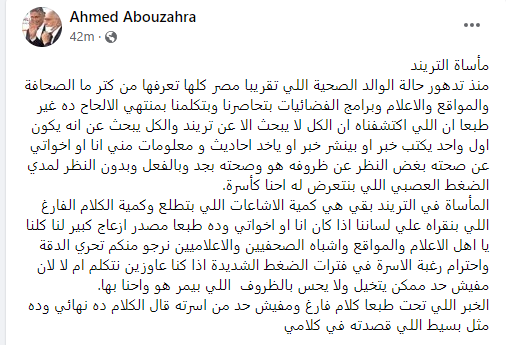 حيث علق أحمد أبو زهرة قائلا : مأساة التريند منذ تدهور حالة الوالد الصحية اللي تقريبا مصر كلها تعرفها من كتر ما الصحافة والمواقع والإعلام وبرامج الفضائيات بتحاصرنا وبتكلمنا بمنتهي الالحاح ده غير طبعا ان اللي اكتشفناه ان الكل لا يبحث إلا عن تريند والكل يبحث عن انه يكون اول واحد يكتب خبر او بينشر خبر او ياخد احاديث و معلومات مني انا او اخواتي عن صحته بغض النظر عن ظروفه هو وصحته بجد وبالفعل وبدون النظر لمدي الضغط العصبي اللي بنتعرض له احنا كأسرة.