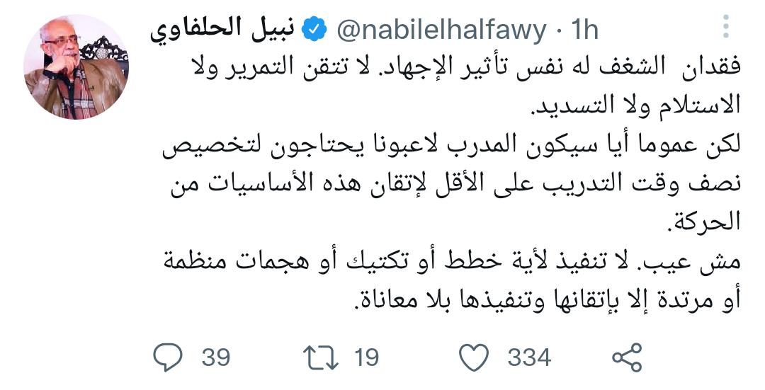 وكتب على تويتر: "فقدان الشغف له نفس تأثير الإجهاد. لا تتقن التمرير ولا الاستلام ولا التسديد.. لكن عموما أيا سيكون المدرب لاعبونا يحتاجون لتخصيص نصف وقت التدريب على الأقل لإتقان هذه الأساسيات من الحركة مش عيب.. لا تنفيذ لأية خطط أو تكتيك أو هجمات منظمة أو مرتدة إلا بإتقانها وتنفيذها بلا معاناة".