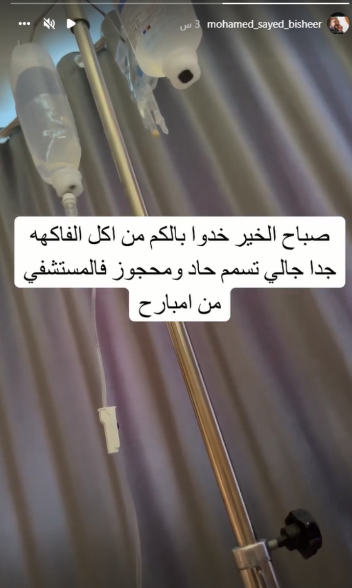 ونشر بشير مقطع فيديو من المستشفى، عبر خاصية ستوري لحسابه الشخصي على موقع تبادل الصور والفيديوهات القصيرة انستجرام، وعلق قائلًا: صباح الخير خدوا بالكم من أكل الفاكهة جدًا جالي تسمم حاد ومحجوز في المستشفى من امبارح.