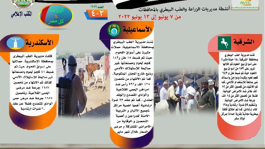 أصدر مركز المعلومات الصوتية والمرئية التابع لوزارة الزراعة واستصلاح الأراضي، والمكتب الاعلامي للوزارة، العدد رقم ٤٥ من اصدار: "الزراعة في كل مصر" بالانفوجراف والفيديو، يوضح الجهود والانشطة التي تقوم بها مديريات الزراعة والطب البيطري بمحافظات الجمهورية خلال الفترة من ٧وحتى ١٣ يونيو الجاري.