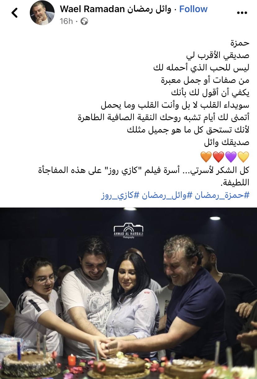 واختتم وائل رمضان:"كل الشكر لأسرتي... أسرة فيلم "كازي روز" على هذه المفاجأة اللطيفة."