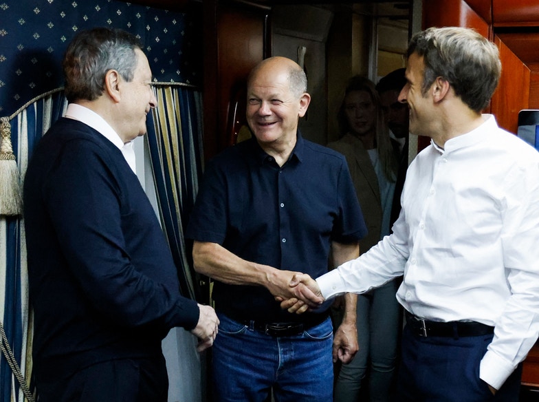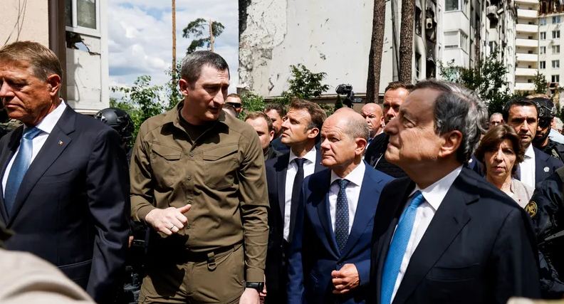يجري كلا من الرئيس الفرنسي إيمانويل ماكرون، والمستشار الألماني أولاف شولتز، ورئيس الوزراء الإيطالي مايو دراجي، زيارة إلى أوكرانيا، منذ أمس الخميس، وذلك بعد 4 أشهر من اشتعال شرارة الحرب بين روسيا وأوكرانيا، وتحرك زعماء أوروبا، إلى كييف عبر بولندا، لعقد سلسلة لقاءات مع الرئيس الأوكراني فولوديمير زيلينسكي.
