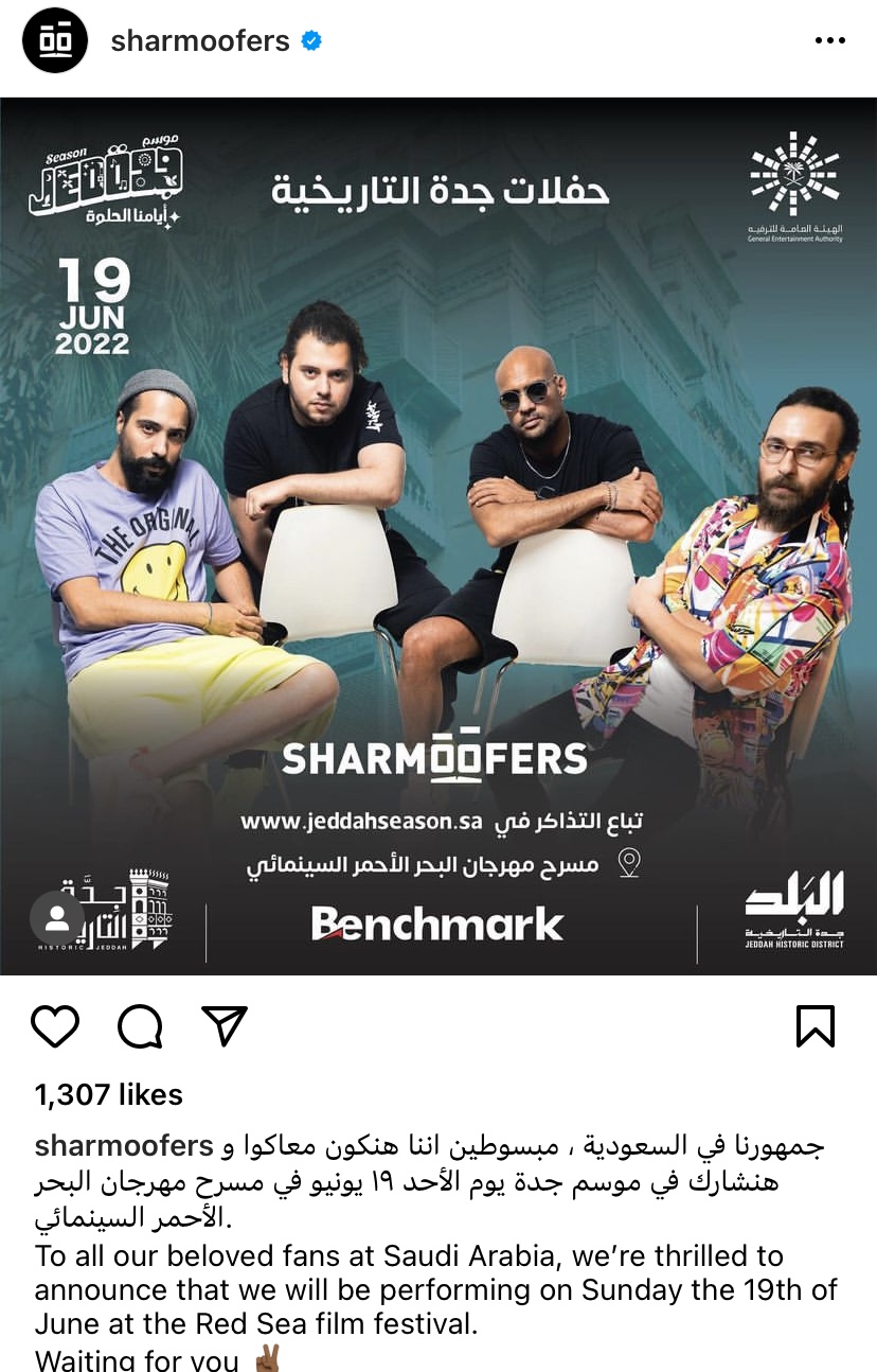 وكتب فريق شارموفرز عبر حسابهم بتطبيق انستجرام :" جمهورنا فى السعودية مبسوطين اننا هنكون معاكوا وهنشارك فى موسم جدة يوم الأحد ١٩ يونيو فى مسرح مهرجان البحر السينمائي ".