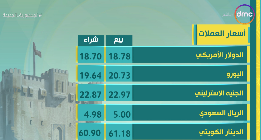 استعرض برنامج "8 الصبح" المُذاع على فضائية dmc، اليوم الاثنين 20- 6 -2022، تقريرًا مُفصلًا عن أسعار العملات الأجنبية والعربية.