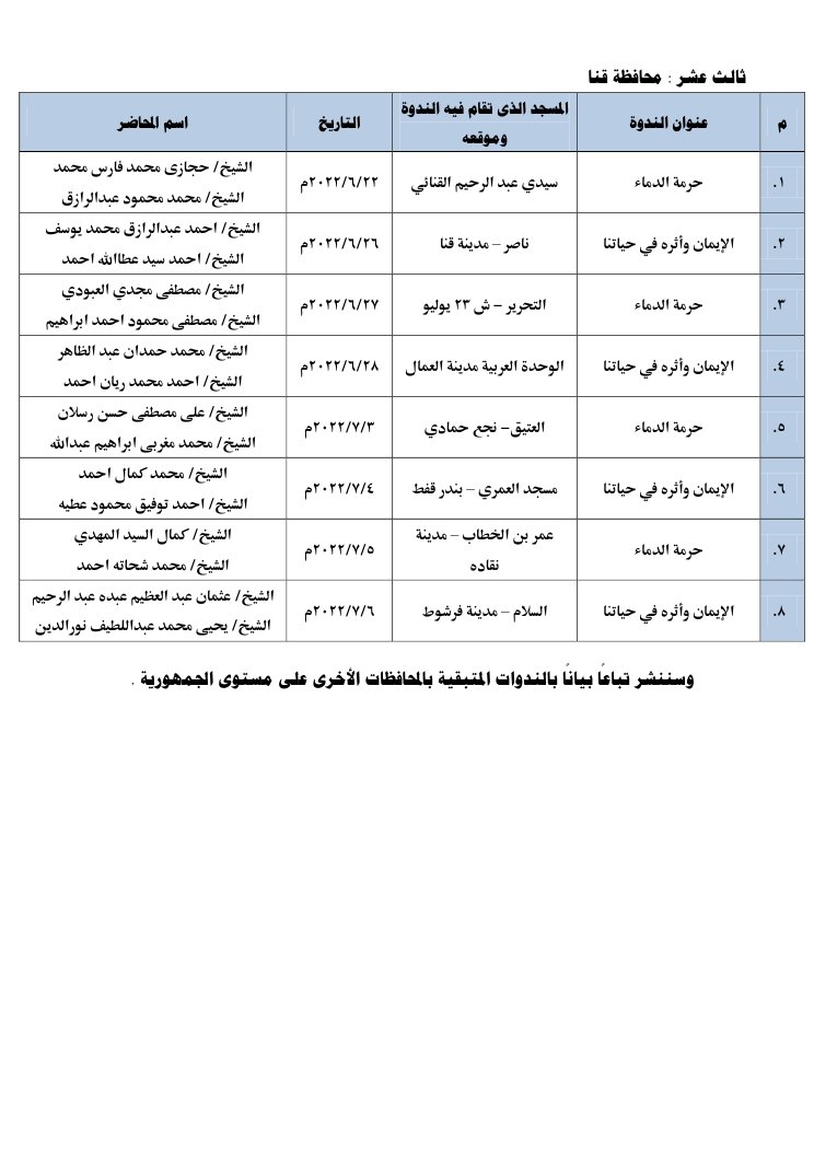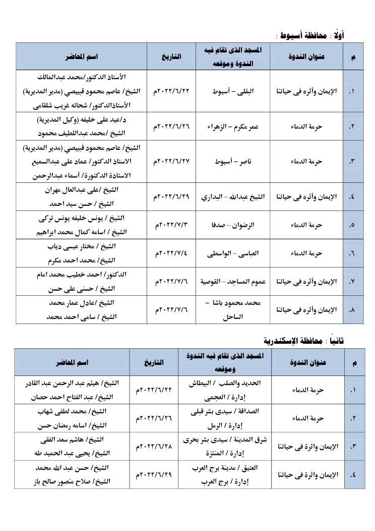 تأتي هذه الندوات تأكيدًا على حرمة الدماء في الإسلام، وبعث ثقافة التسامح والسلام النفسي والمجتمعي، من خلال تعميق الإيمان في قلوبنا وحياتنا؛ باعتباره أحد أهم المؤثرات القوية في تصرفات الإنسان سلوكًا وعملًا ، وذلك على النحو التالي :