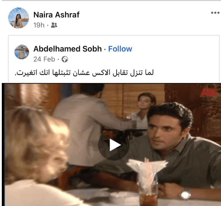 وكان آخر منشورات الطالبة نيرة أشرف عبر موقع التواصل الاجتماعى “ فيسبوك ” كان فيديو للفنان أحمد عز بعنوان “ لما تنزل تقابل الاكس علشان تثبتلها إنك اتغيرت ”.