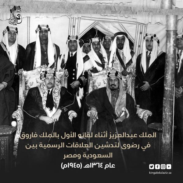 وبينت صورة تعود لعام 1364 هـ (1945 م) الملك عبدالعزيز مع الملك فاروق الذي كان يرتدي الزي السعودي، في منطقة رضوى بالمدينة المنورة، وكان الملك المؤسس يعمل في ذلك الوقت على تدشين العلاقة الرسمية بين المملكة ومصر.