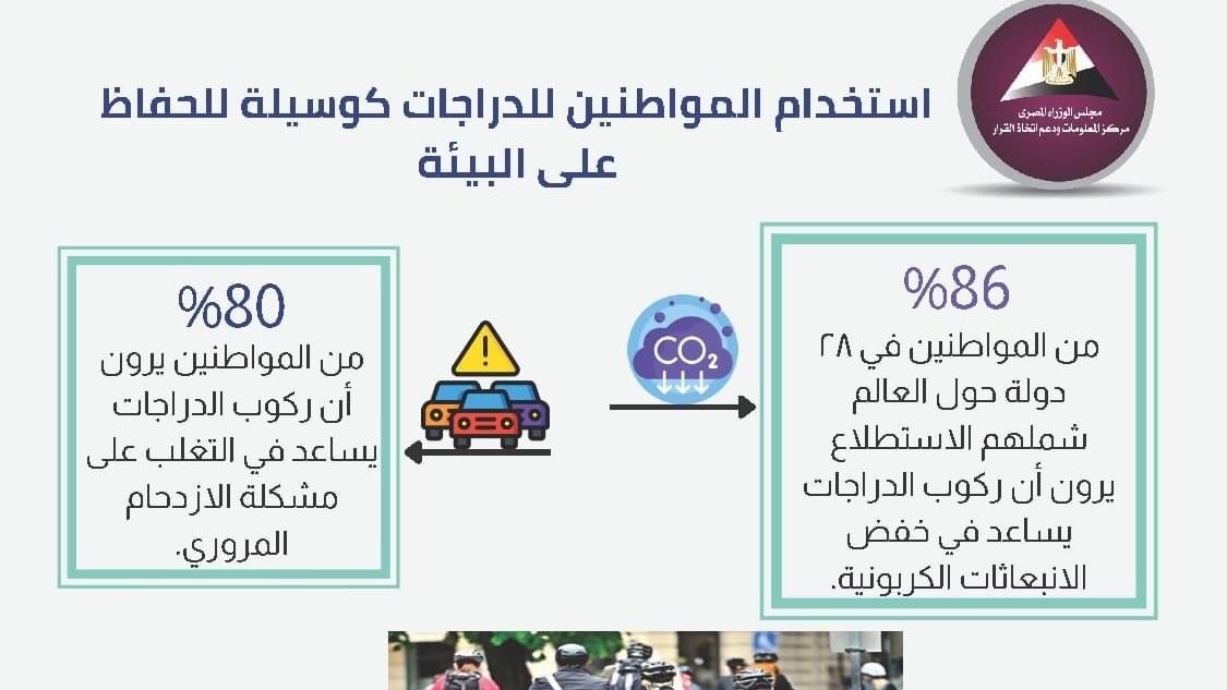 نشر مركز المعلومات ودعم اتخاذ القرار بمجلس الوزراء انفوجراف عبر صفحته الرسمية على موقع التواصل الاجتماع فيس بوك حول استخدام المواطنين للدراجات كوسيلة للحفاظ على البيئة .