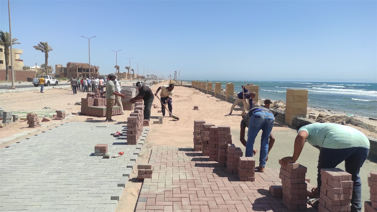 وقد رصد موقع " صدي البلد " الاخباري العمال الشقيانين في عز نهار الصيف والذين يعملون في مشروع كورنيش الجبيل .