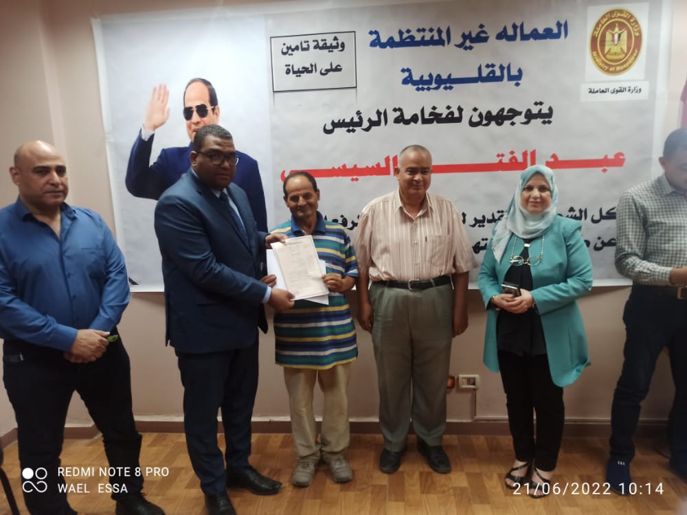 أناب محمد سعفانوزير القوى العاملة، إيمان شحاته مدير مديرية القوي العاملة بمحافظة القليوبية بتسليم 152 وثيقة للتأمين ضد الحوادث الشخصية للعمالة غير المنتظمة "الدفعة الثانية" من المسجلة بالمديرية تغطي الوفاة، والعجز الكلى المستديم، والجزئي، تنفيذا لمبادرة "حياة كريمة"، التي أطلقها الرئيس عبد الفتاح السيسي.