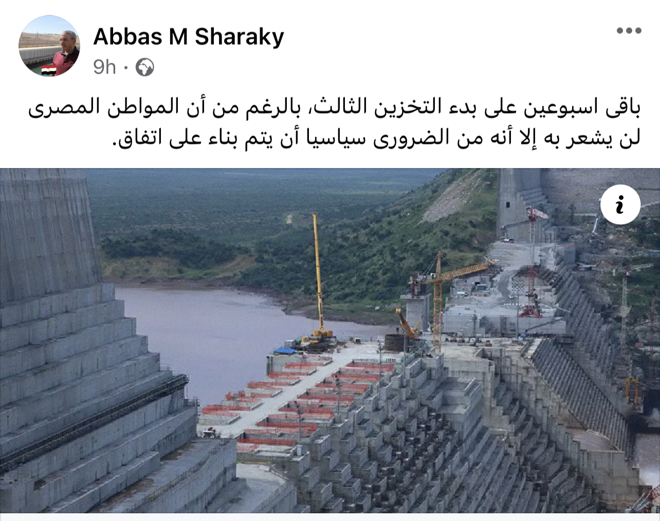 أوضح الدكتور عباس شراقى أستاذ الجيولوجيا و الموارد المائية بجامعة القاهرة، أن الملء الثالث لسد النهضة سوف يبدأ بعد اسبوعين.