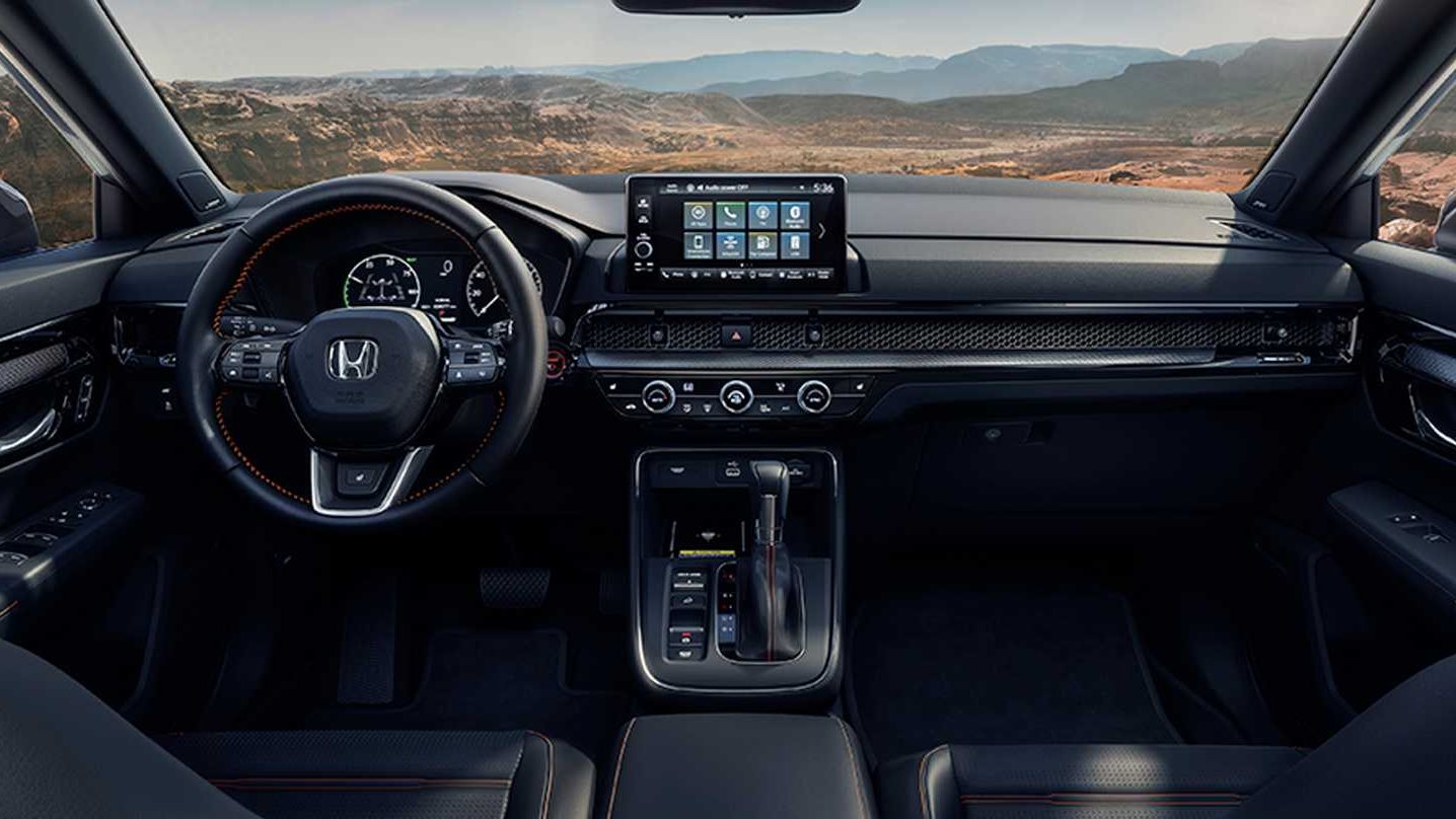 تتميز 2023 CR-V بنفس التصميم العام، حيث توجد شاشة المعلومات والترفيه فوق الشبكة الممتدة للوحة العدادات والتي تخفي بذكاء فتحات التهوية والتكييف.