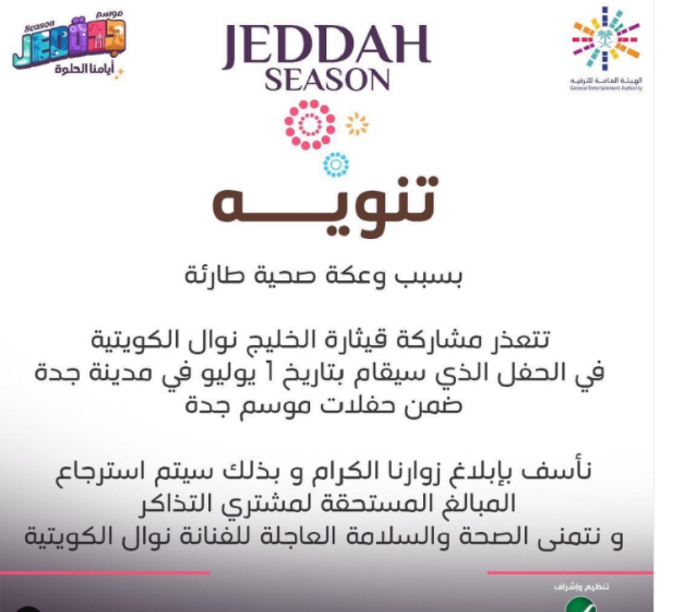 ونشرت شركة روتانا، بيانا عبر حسابها الشخصي بموقع انستجرام، جاء فيه: تنويه بسبب وعكة صحية طارئة، تتعذر مشاركة قيثارة الخليج نوال الكويتية، في الحفل الذي من المقرر أن يقام في تاريخ 1 يوليو، في جدة ضمن حفلات موسم جدة، نأسف بإبلاغ الزوار الكرام وبذلك سيتم استرجاع المبالغ المستحقة لمشتري التذاكر ونتمنى الصحة والسلامة العاجلة للفنانة نوال الكويتية.