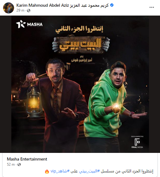شوق الفنان كريم محمود عبد العزيز المتابعين للجزء الثاني من مسلسل “البيت بيتي”، عبر حسابه الشخصي بموقع التواصل الاجتماعي “فيسبوك”.