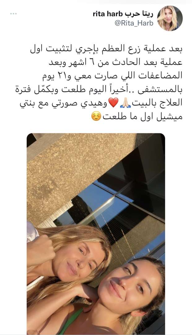 وكتبت ريتا حرب:"بعد عملية زرع العظم بجري لتثبيت أول عملية بعد الحادث من 6 أشهر، وبعد المضاعفات اللي صارت معي و21 يوما بالمستشفى، أخيراً اليوم طلعت وبكمّل فترة العلاج بالبيت وهيدي صورتي مع بنتي ميشيل أول ما طلعت".