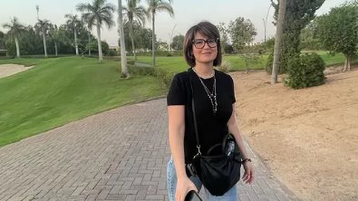 وظهرت هنا شيحة في الصورة مرتدية قميص باللون الأبيض، تاركة خصلات شعرها القصيرة منسدلة، واضعة وشاح باللون الأبيض علي شعرها.