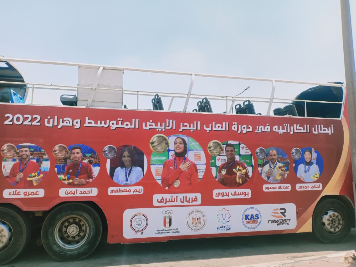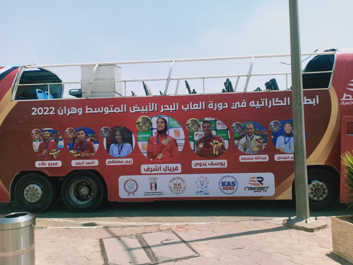 وتواجد أتوبيس خاص مكشوف أمام صالة الوصول بمبني الركاب رقم 1 بمطار القاهرة، استعدادا لصعود أبطال الكاراتيه على متنه فور خروجهم من المطار، عقب وصولهم رحلة الخطوط الجزائرية.
