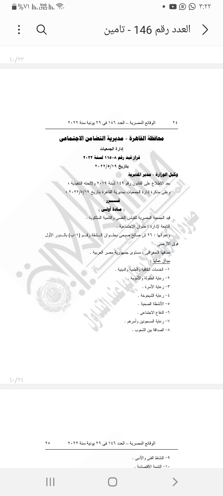 وعلى اجتماع الجمعية العموميـة غيـر العاديـة المنعقـد بتـاريخ ۲۰۲۱/٩/٢٤ لجمعية كارتياس مصر بشأن الموافقة على توفيق الأوضاع طبقا لأحكام القانون رقـم 149 ولائحته التنفيذية وعلى الطلب المقدم من أيمن صادق تقاوى يوسـف المفـوض عـن جمعيـة کارتیاس مصر لتوفيق الأوضاع ورقيا وإلكترونيا بمديرية التضامن الاجتماعي بالقاهرة وعلى المذكرة المعروضة من إدارة الشئون القانونية بتاريخ ۲۰۲۲ تقرر توفيق أوضاع جمعية كارتياس مصر طبقا لأحكـام القانون رقم 149 لسنة ٢٠١٩.