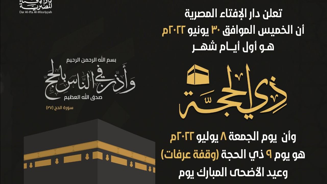 وعلى ذلك كله تُعلن دارُ الإفتاءِ المصريةُ أن يومَ الخميس الموافق الثلاثين من شهر يونية لعام ألفين واثنين وعشرين ميلاديًّا هو أول أيام شهر ذي الحجة لعام ألفٍ وأربعمائةٍ وثلاثة وأربعين هجريًّا.