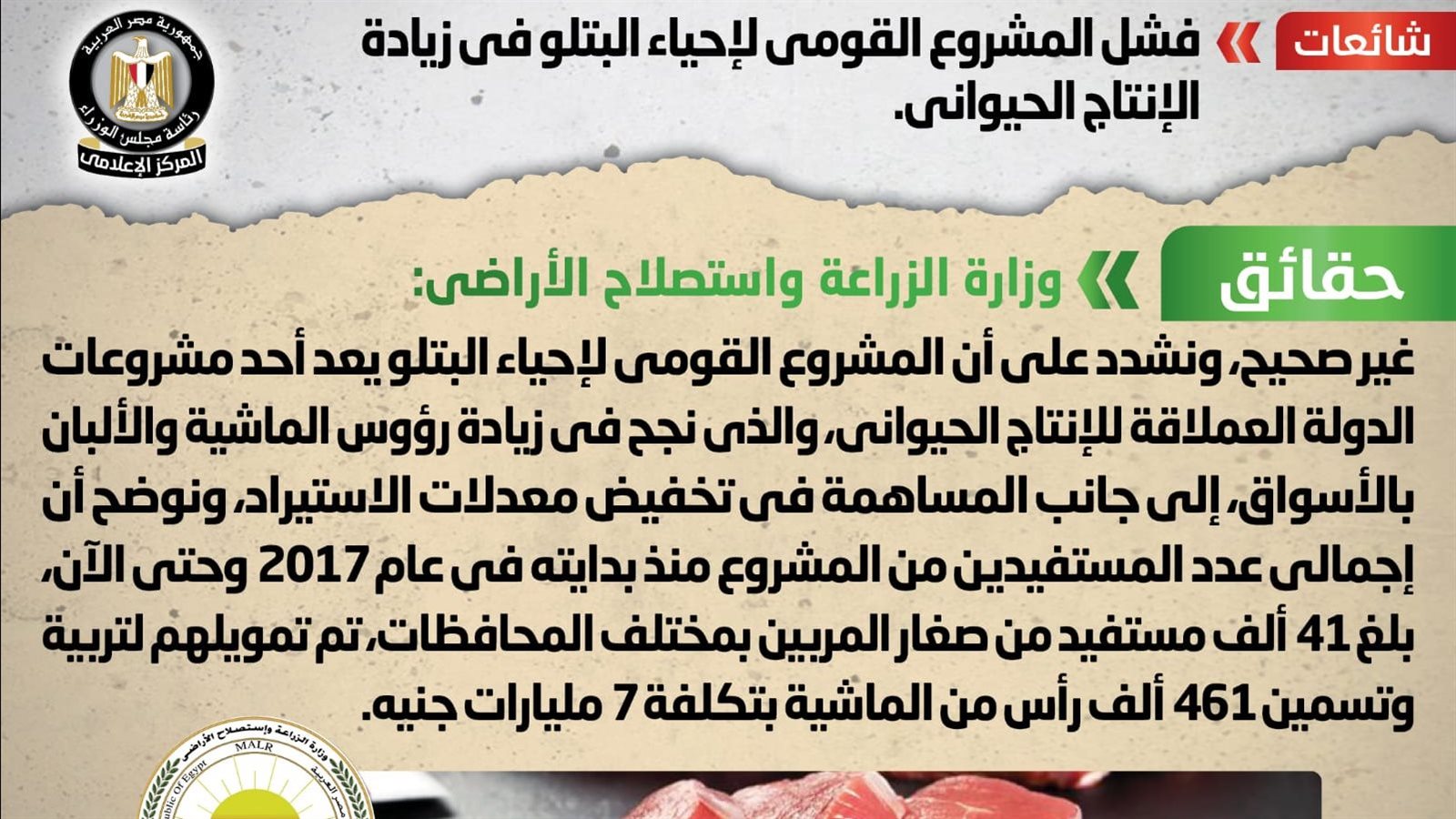 انتشر في بعض المواقع الإلكترونية وصفحات التواصل الاجتماعي أنباء بشأن فشل المشروع القومي لإحياء البتلو في زيادة الإنتاج الحيواني، وقد قام المركز الإعلامي لمجلس الوزراء بالتواصل مع وزارة الزراعة واستصلاح الأراضي، والتي نفت تلك الأنباء، مُؤكدةً أنه لا صحة لفشل المشروع القومي لإحياء البتلو في زيادة الإنتاج الحيواني.
