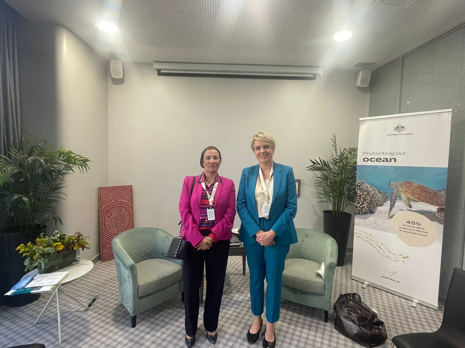 التقت الدكتورة ياسمين فؤاد وزيرة البيئة مع Tanya Plibersek وزيرة البيئة الاسترالية على هامش مشاركتها في مؤتمر الأمم المتحدة المعني بالمحطات ٢٠٢٢ بلشبونة، والذي تستضيفه حكومتا البرتغال وكينيا خلال الفترة من 27 يونيو إلى 1 يوليو 2022 تحت شعار "أنقذوا محيطاتنا، واحموا مستقبلنا"، حيث بحثتا سبل التعاون الثنائي في موضوعات صون التنوع البيولوجي في ظل التكيف مع آثار تغير المناخ، وإدارة المياه، و تكنولوجيا انتاج بدائل الأكياس البلاستيكية أحادية الاستخدام، بالإضافة إلى دعم أجندة العمل المناخي من خلال استضافة مصر لمؤتمر المناخ القادم COP27.
