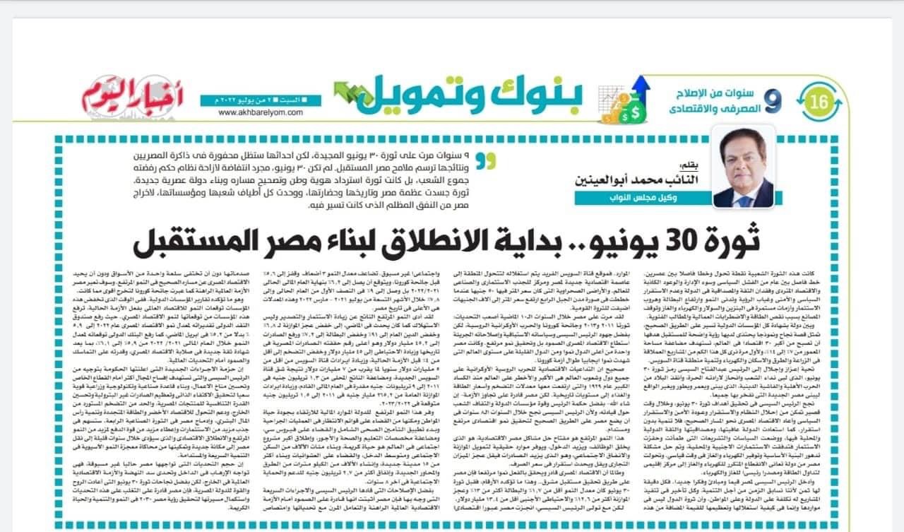 9 سنوات مرت على ثورة 30 يونيو المجيدة ، لكن أحداثها ستظل محفورة في ذاكرة المصريين، ونتائجها ترسم ملامح مصر المستقبل. لم تكن 30 يونيو، مجرد انتفاضة لإزاحة نظام حكم رفضته جموع الشعب، بل كانت ثورة استرداد هوية وطن وتصحيح مساره وبناء دولة عصرية جديدة. ثورة جسدت عظمة مصر وتاريخها وحضارتها، ووحدت كافة أطياف شعبها ومؤسساتها، لإخراج مصر من النفق المظلم الذي كانت تسير فيه.