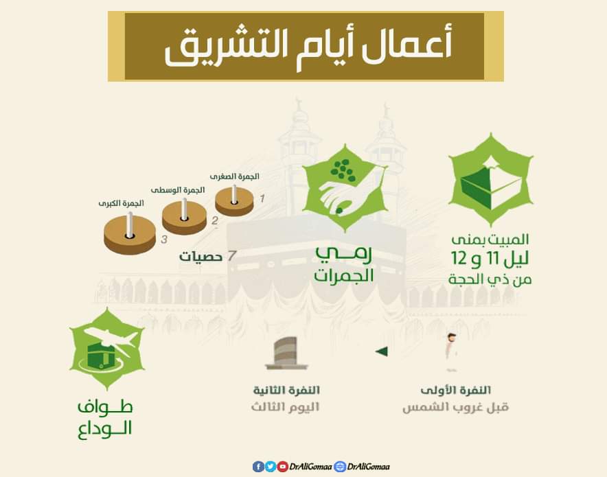 وقال علي جمعة من خلال صفحته الرسمية بموقع التواصل الاجتماعي فيس بوك: أول أيام التشريق وثانيها: هما ثاني أيامُ عيدِ الأضحى المباركِ وثالثها، وفيهما يقومُ الحاجُّ بما يلي: