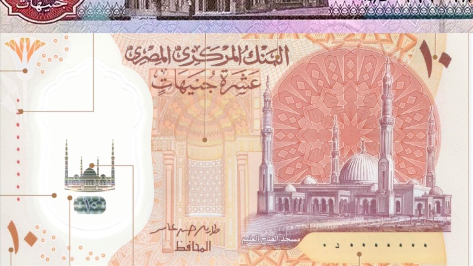 وتم تصميم العشرة جنيهات الجديدة بطابع عصري حديث ومبتكر، حيث تتزين العملة الجديدة بمسجد الفتاح العليم باعتباره أحد معالم الطرازات المعمارية الإسلامية بالعاصمة الإدارية الجديدة، وكذلك الحضارة الفرعونية ممثلة في تمثال حتشبسوت والذي يعكس هوية الدولة المصرية القديمة، لتربط العملة الجديدة عراقة التاريخ المصري القديم مع العصر الحديث، وتجمع بين حضارة الأجداد وما أنجزه الأحفاد.