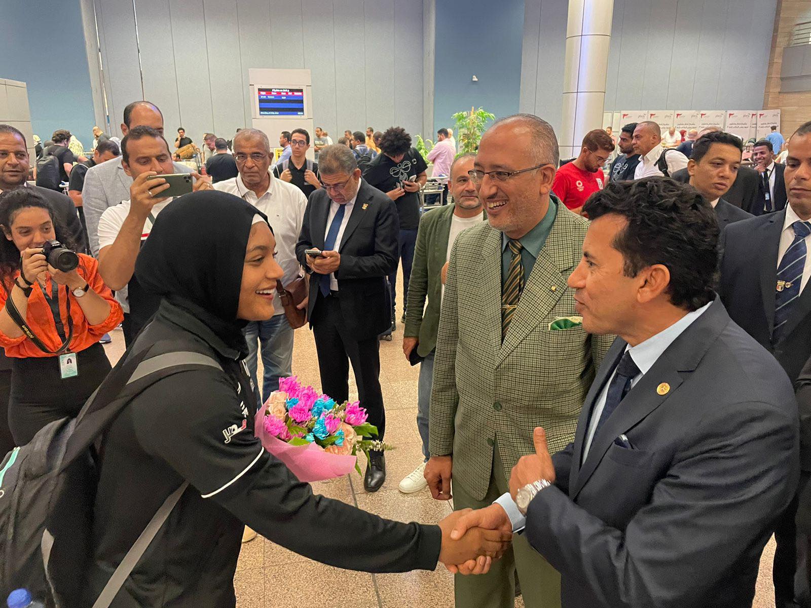استقبل الدكتور أشرف صبحي وزير الشباب والرياضة ، الفوج الأخير من البعثة المصرية التي شاركت في دورة ألعاب البحر المتوسط ومنهم المنتخب المصري لكرة اليد وأبطال الشراع وألعاب القوى ورفع الأثقال، والسلاح إضافة إلى البعثة الإدارية المرافقة وذلك علي متن طائرات خاصة قامت بتوفيرها وزارة الشباب والرياضة بالتنسيق مع وزارة الطيران المدني، ومختلف الجهات، فى إطار تهيئة المناخ العام حول جميع اللاعبين المشاركين بمنافسات الدورة، بحضور رئيس اللجنة الأوليمبية المهندس هشام حطب، ولفيف من رؤساء الاتحادات الرياضية، وقيادات وزارة الشباب والرياضة وروابط الرياضية.