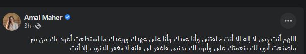ونشرت آمال ماهر دعاء ديني عبر حساباتها على مواقع التواصل الاجتماعي دون أي تعليق آخر، جاء فيه:" اللهم أنت ربي لا إله إلا أنت خلقتني وأنا عبدك وأنا علي عهدك ووعدك ما استطعت أعوذ بك من شر ماصنعت أبوء لك بنعمتك علي وأبوء لك بذنبي فاغفر لي فإنه لا يغفر الذنوب إلا أنت".