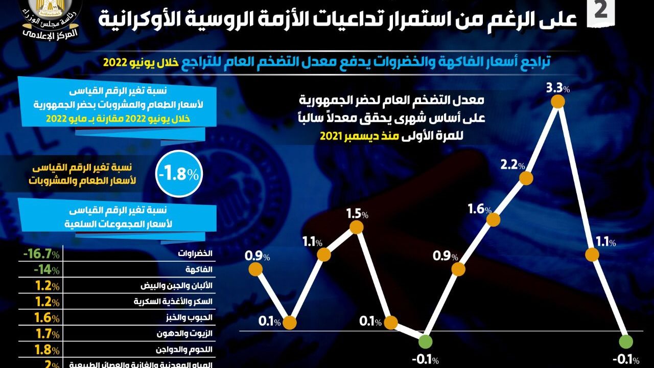 وكشف التقرير عن تحقيق التضخم العام لحضر الجمهورية على أساس شهري معدلاً سالباً للمرة الأولى منذ ديسمبر 2021، حيث سجل - 0.1% في يونيو 2022، مقارنة بتسجيله 1.1% في مايو 2022، و3.3% في أبريل 2022، و2.2% في مارس 2022، و1.6% في فبراير 2022، و0.9% في يناير 2022.