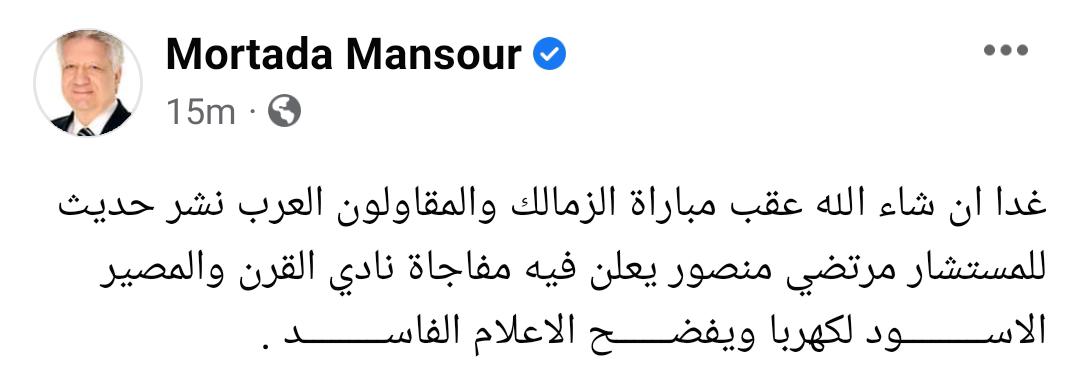 وكتب: “غدا ان شاء الله عقب مباراة الزمالك والمقاولون العرب نشر حديث للمستشار مرتضي منصور يعلن فيه مفاجأة نادي القرن والمصير الأســـــــــود لكهربا ويفضــــــح الإعلام الفاســـــــــد”.