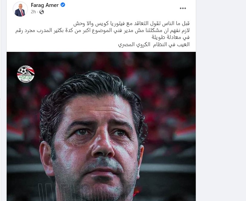 وكتب فرج عامر عبر صفحته الشخصية على موقع التواصل الاجتماعي “فيس بوك”:" قبل ما الناس تقول التعاقد مع فيتوريا كويس ولا وحش، لازم نفهم إن مشكلتنا مش مدير فني الموضوع أكبر من كدة بكتير المدرب مجرد رقم في معادلة طويلة".