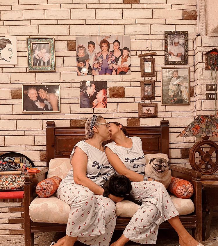 وعلقت ناهد السباعي على الصور قائلة:" ما يطلبه المستمعون.. بيجامة العيد"، وظهرت مرتدية ملابس مشابهه لوالدتها التي منحتها قبلة بهذه المناسبة، وظهرت في الصور الفنانة آية سماحة زوجة محمد السباعي شقيقها.